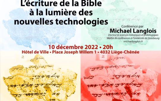 Writing the Bible in Light of New Technologies, in Liège, 10 Dec 2022 Posted on Saturday December 10th, 2022Friday February 3rd, 2023 by Michael Langlois I am invited to give a lecture in Liège, Belgium, on “Writing the Bible in Light of New Technologies”.... Read More